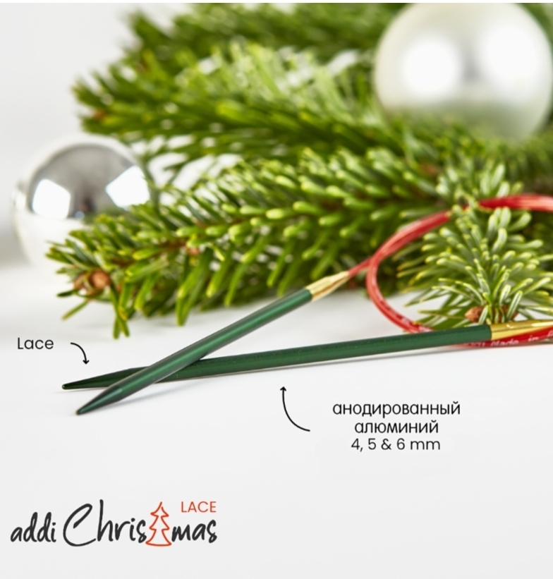Уникальные круговые спицы addiChristmas с острыми кончиками созданы для наслаждения вязанием в уютные Рождественские вечера. Спицы addiChristmas сочетают в себе доказанное качество круговых спиц addi и любимые Рождественские цвета — зеленый, красный и золотой. Спицы сделаны из матового анодированного алюминия элегантного зеленого цвета с выгравированным названием «addiChristmas». Прекрасный подарок для всех любителей вязания к любому празднику, а не только на Рождество.